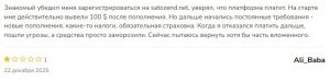 При изучении репутации брокера стало известно, что отзывы о площадке Satozend сплошь отрицательные. Клиенты в один голос заявляют, что брокер обманывает клиентов с выводом денег. Один из пострадавших написал, что внес довольно крупный депозит. Но в дальнейшем он не смог вывести не только прибыль, но и вложенные средства.