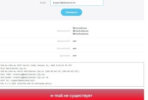 При изучении контактных данных подозрение пало на адрес электронной почты, который является основным способом связи с техподдержкой. Ведь при проверке с помощью специального сервиса стало известно, что данный адрес попросту не существует. Это явный признак мошенничества.